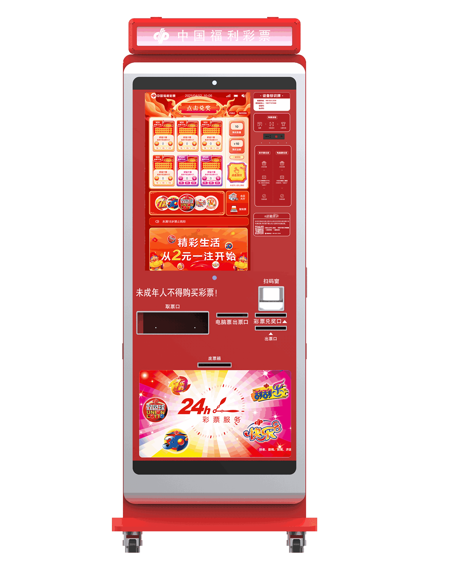 支持多種電腦彩票、六種即開型彩票及整包刮刮樂同時銷售。購彩者可通過語音、觸屏操控購票,微信、支付寶支付,終端系統實施自動兌獎,也可在官方小程序直接兌獎,減少終端運維,解決售彩難點,可廣泛用于大型商超、酒店、電影院等多種兼營場所。